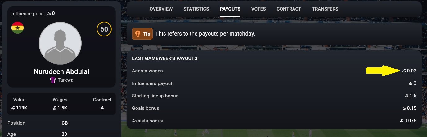 Agents get paid 0.002% of the player’s weekly wage. The higher the rating of a player, the higher the agents wage is - if a new contract is signed with the players higher rating. You can check the agents wage by visiting the player profile and clicking the PAYOUTS tab.