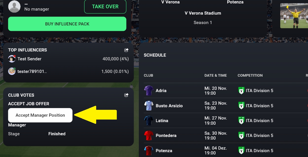 1) Der Verein wird derzeit nicht gemanagt oder der aktuelle Manager war für einen bestimmten Zeitraum inaktiv. In diesem Fall gehen Sie zur Vereinsübersicht und klicken Sie auf die Schaltfläche "Übernehmen". Sie benötigen dafür keinen Einfluss.