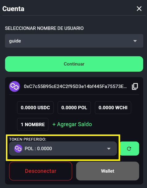 Los usuarios avanzados pueden establecer un token preferido en la ventana emergente de la cuenta para pagar las tarifas de gas. Sin embargo, pagar directamente con POL será ligeramente más económico al final, ya que no se necesita una conversión automática.