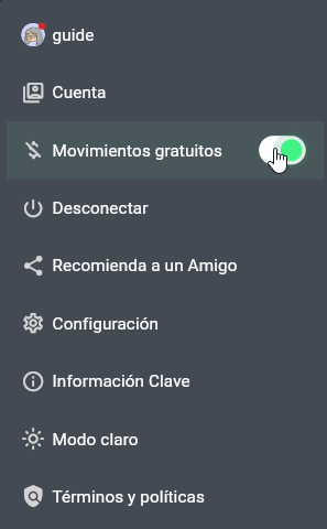 Para activar/desactivar movimientos/transacciones gratuitas, usa el interruptor en el menú desplegable debajo de tu nombre de usuario. Los movimientos gratuitos están activados por defecto.