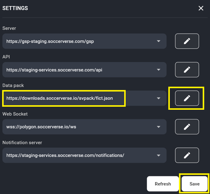 Esto se hace en la sección de configuración del juego y en la sección Paquete de datos. Pega la URL de tu paquete de datos cargado y haz clic en guardar.
