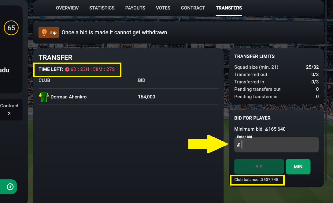 Una vez que se alcanza la oferta máxima, la subasta finaliza y el jugador se agregará a su nuevo club.
