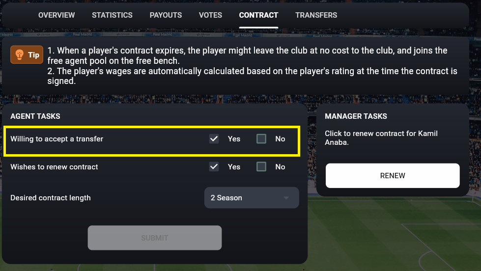 Por favor, consulta también las restricciones del equipo en las secciones anteriores si tienes problemas para listar tu jugador para transferencia. Si todo está claro en ese aspecto, el agente puede haber establecido la elegibilidad de transferencia de ese jugador en "No". Puedes verificar esto yendo a la pestaña CONTRATO en el perfil del jugador. Si un agente realmente estableció la elegibilidad de transferencia en "No", puedes abstenerte de vender este jugador o hablar con el agente del jugador y encontrar una solución. (Ver también la sección "AGENTES" en esta guía).