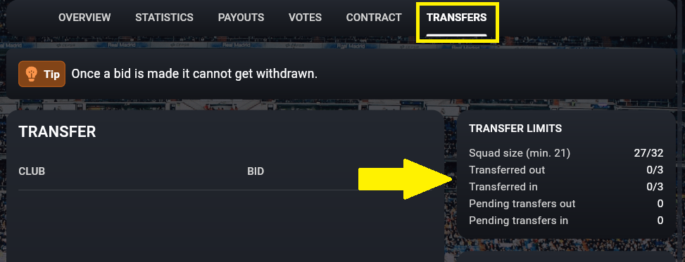 Los mánagers solo pueden intercambiar un máximo de 10 jugadores con otros clubes por temporada: 5 de entrada y 5 de salida. Puedes verificar tus límites de transferencia actuales visitando el perfil de un jugador y yendo a la pestaña TRANSFERENCIAS. En la parte superior derecha puedes ver el cuadro de LÍMITES DE TRANSFERENCIA de tu club, que realiza un seguimiento de tu actividad de transferencias cada temporada. Los límites de transferencia están sujetos a cambios, si el equipo de Soccerverse ve una necesidad y/o la comunidad está de acuerdo.