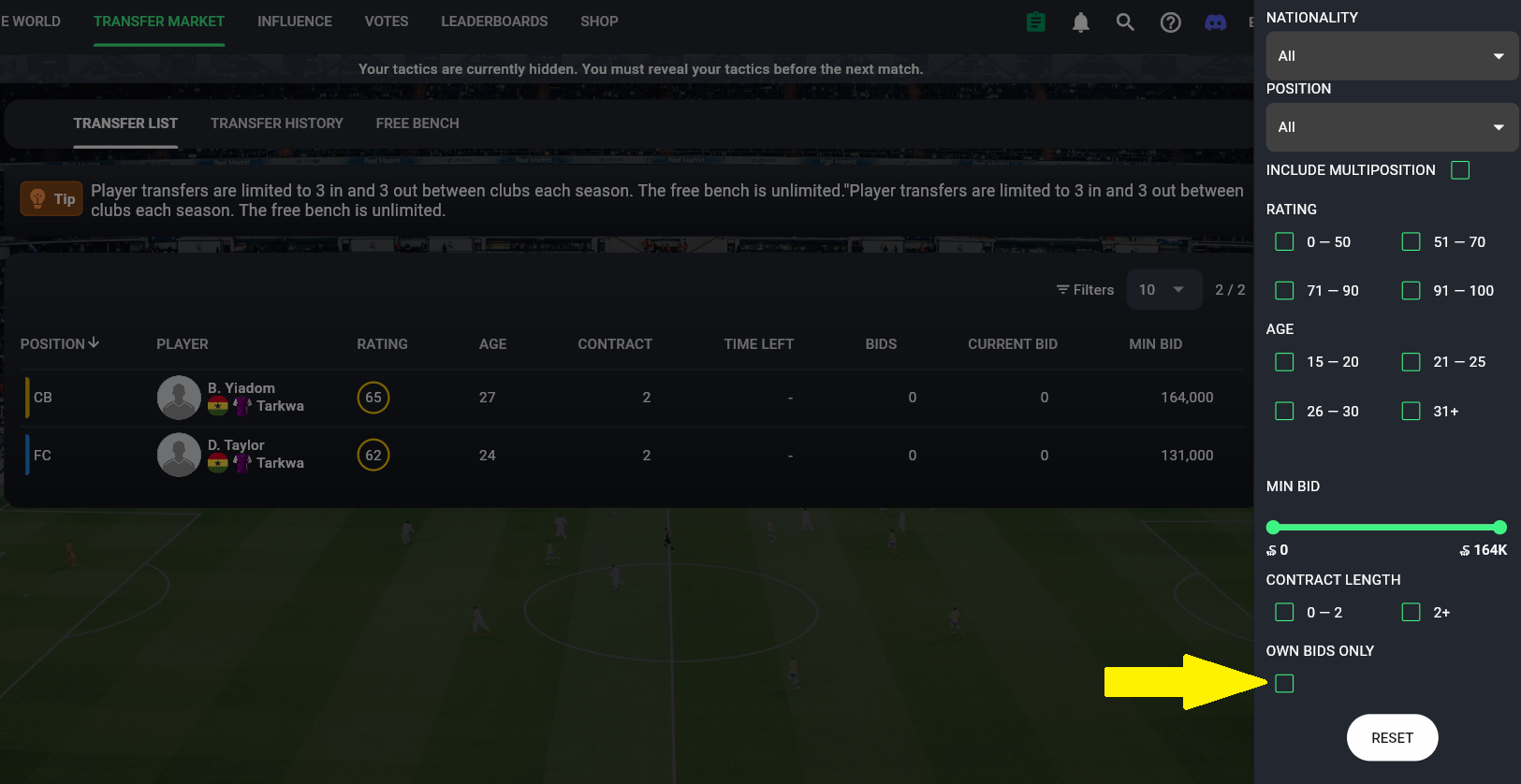 El filtro en la pantalla del mercado de transferencias también te permite mostrar solo los jugadores donde actualmente eres el mejor postor.