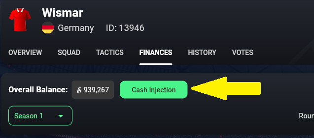 Pour injecter votre SVC personnel dans un club, accédez simplement à l'onglet Finances du club concerné et cliquez sur le bouton « Injection de liquidités ».