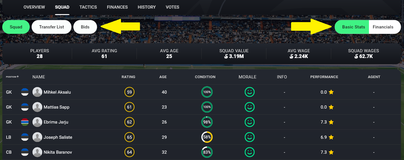 En passant des STATS DE BASE aux FINANCES, vous pouvez voir les évaluations de vos joueurs, leurs salaires et la durée de leurs contrats individuels. Tout est triable en cliquant sur les en-têtes de colonnes.\