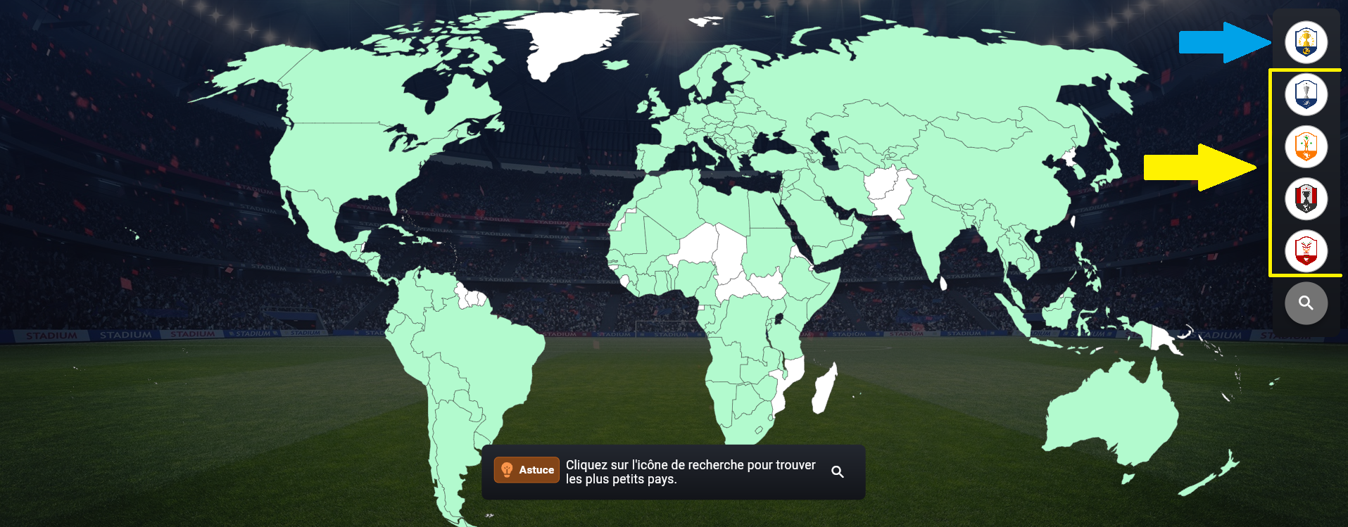 Avec cette carte, vous pouvez voir quels pays sont présents dans Soccerverse. Vous pouvez zoomer pour trouver les plus petits pays, mais certains pays sont trop petits pour être affichés correctement. Ces pays sont : Singapour, Hong Kong, Maurice, Andorre, Saint-Marin et Gibraltar. Utilisez simplement l'icône de recherche pour trouver ces pays.