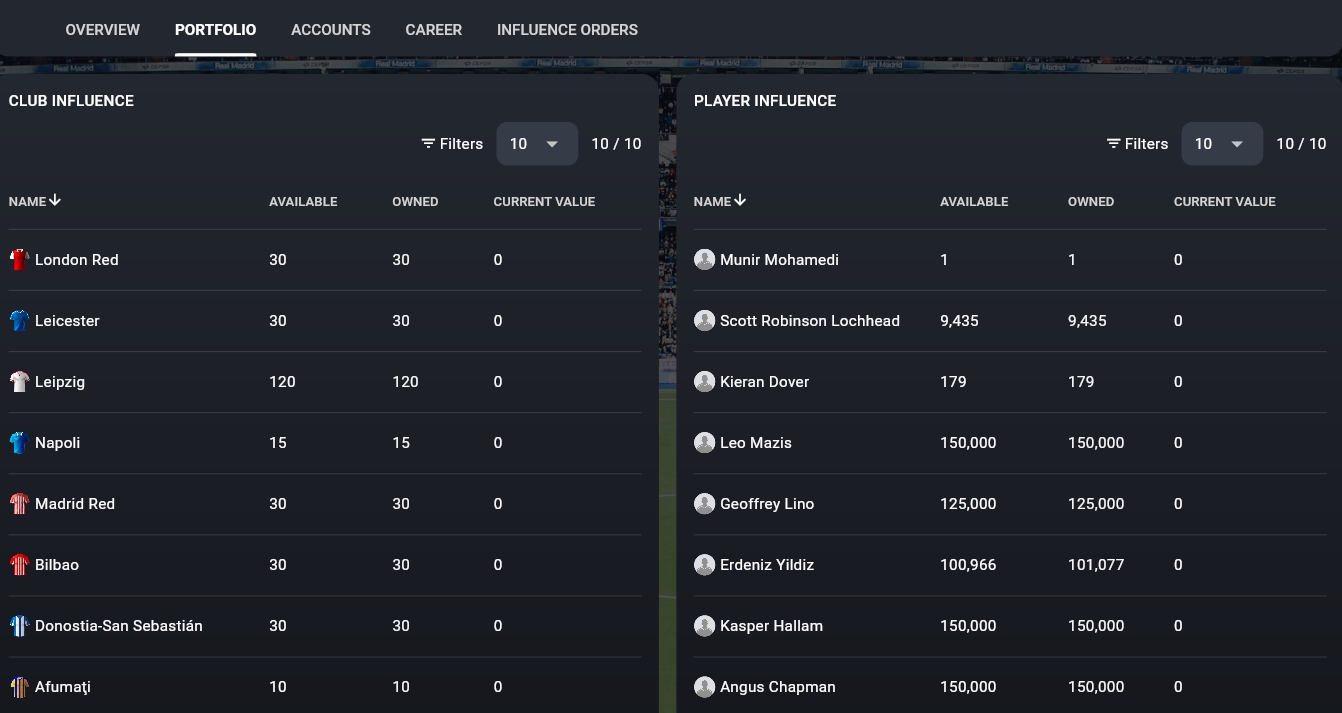 L'influence consiste essentiellement à posséder (une partie d') un club ou un joueur. Elle vous permet de participer à la prise de décision pour un club ou un joueur.