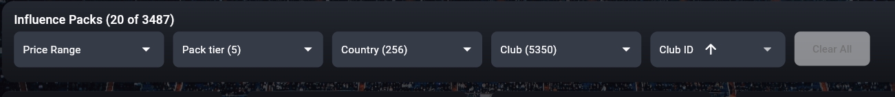 En haut, vous pouvez utiliser des filtres pour trouver plus facilement ce que vous cherchez. Vous pouvez utiliser des filtres pour la fourchette de prix, le niveau de pack, les pays, les clubs et vous pouvez trier les résultats.