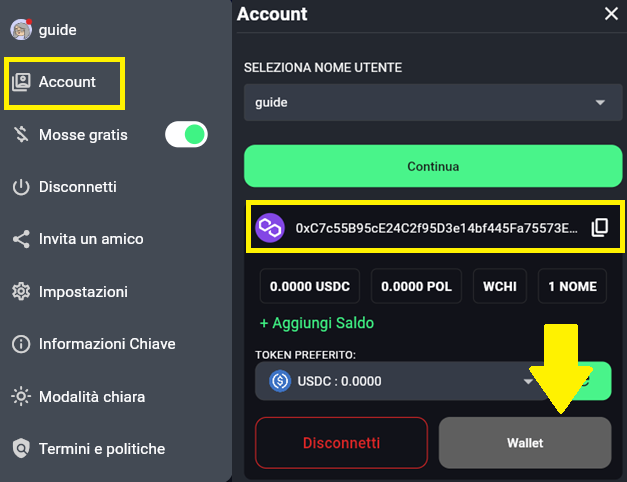 Il tuo portafoglio in-game contiene il tuo nome Xaya (che usi per accedere al gioco), il tuo POL e qualsiasi altra criptovaluta che hai nel tuo portafoglio, di cui POL, USDC e WCHI vengono visualizzati nel popup dell'account. L'indirizzo del tuo portafoglio viene visualizzato accanto al logo Polygon e alle statistiche con 0x......