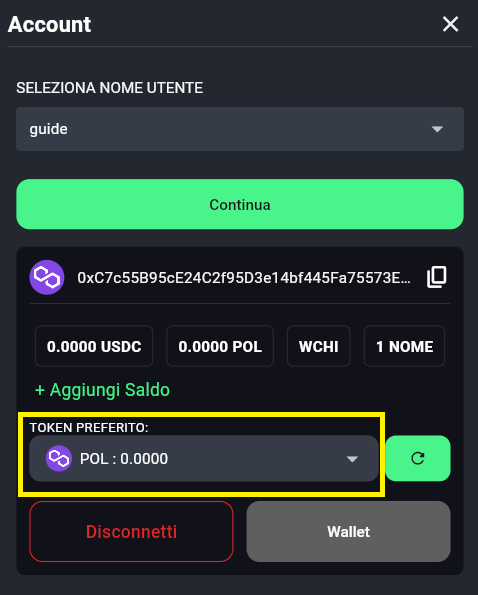Gli utenti avanzati possono impostare un token preferito nel popup dell'account per pagare le commissioni del gas. Pagare direttamente con POL sarà comunque leggermente più economico alla fine, poiché non è necessaria alcuna conversione automatica.
