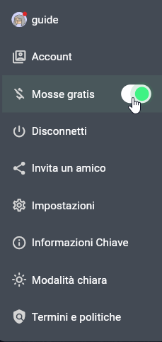 Per abilitare/disabilitare le mosse/transazioni gratuite, usa l'interruttore nel menu a tendina sotto il tuo nome utente. Le mosse gratuite sono abilitate per impostazione predefinita.