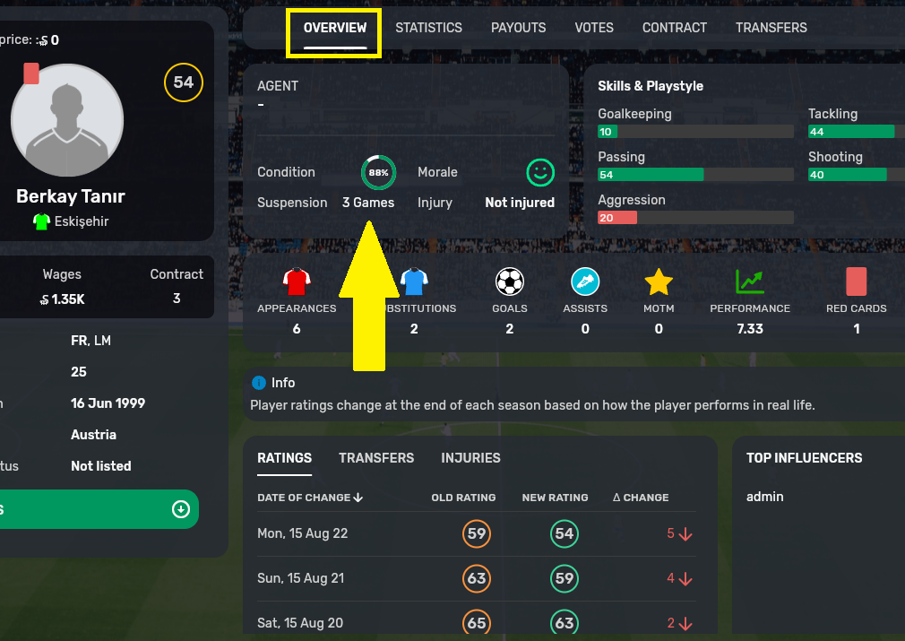 Puoi controllare la durata della sospensione del tuo giocatore nel feed delle notizie del tuo club o visitando il suo profilo giocatore.