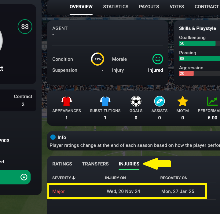 Puoi controllare il feed delle notizie del tuo club o visitare la pagina del profilo del giocatore. Nella scheda panoramica, troverai una scheda chiamata INFORTUNI in basso al centro.