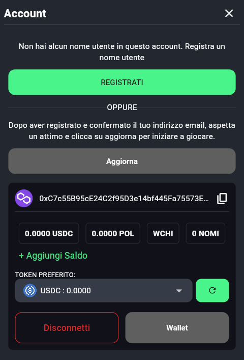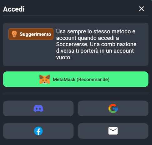 NOTA IMPORTANTE: Assicurati che ogni volta che accedi stai utilizzando a) l'esatto stesso metodo di accesso (Discord, Google, email, Facebook) che è stato utilizzato durante la registrazione iniziale a Soccerverse e b) l'esatto stesso account (account Discord, account Google, indirizzo email, account Facebook). Qualsiasi altra combinazione di questi ti porterà in un portafoglio diverso/vuoto.