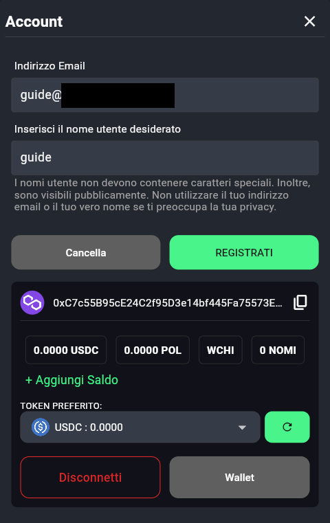 Nel popup successivo, inserisci il nome utente desiderato e clicca su registrati.