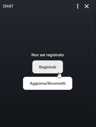 Cerca l'icona della chat nell'angolo in basso a destra e clicca sul pulsante registrati. Dopo che la registrazione è confermata, potresti dover premere il pulsante "Aggiorna/Riconnetti".