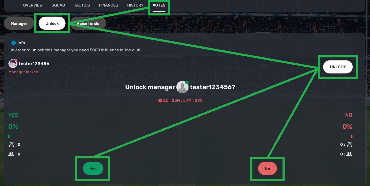 Para desbloquear treinadores, precisará de pelo menos 500 de influência num clube. A votação de desbloqueio durará 3 dias e qualquer influenciador é elegível para participar e votar a favor ou contra o desbloqueio de um treinador.