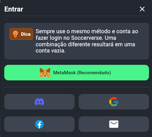 ****NOTA IMPORTANTE: Certifique-se que sempre que entrar está a usar a) exatamente o mesmo método de entrada (Discord, Google, email, Facebook) que foi usado quando inicialmente se registou no Soccerverse e b) exatamente a mesma conta (conta Discord, conta Google, endereço de email, conta Facebook).******** ****Qualquer outra combinação destes irá levá-lo a uma carteira diferente/vazia.