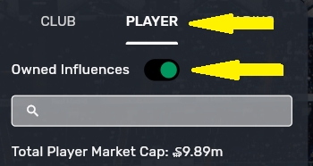 選手の影響力市場は、トップメニューバーのINFLUENCEタブをクリックし、その後PLAYERサブタブをクリックすることで見つけることができます。影響力を購入したい選手を見つけやすくする検索バーがあります。 上部にはスライダーがあり、有効にすると、すでに影響力を所有している選手のみが表示されます。