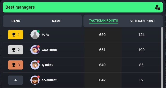 ベストマネージャーのリーダーボードは「戦術家」と「ベテラン」に分かれています。 戦術家ポイントは、対戦相手の強さと予想される試合結果に関連して、試合結果に応じてマネージャーに与えられ、マネージャーの質を示します。より強いチームに勝つほど多くのポイントが得られますが、負ける場合は相手が弱いほど多くのポイントを失います。つまり、ナショナルカップで上位ディビジョンのチームに負けた場合、彼らに勝つことは期待されていないため、ほとんどポイントを失いません。 ポイントの計算は、チェスのゲームでご存知かもしれないEloレーティングシステムに基づいています。試合の予想結果を計算する際には、各チームの上位20人の選手が考慮されます。 ベテランポイントは、Soccerverseでマネージャーとしてプレイした試合で獲得したポイントの数で、勝利 = 2ポイント、引き分け = 1ポイント、敗北 = 0ポイントとなります。このポイントは、マネージャーの質について必ずしも何も示さないかもしれないので、注意して扱ってください。Soccerverseを数シーズンプレイしたユーザーは、Soccerverseでプレイとマネージングを始めたばかりのユーザーに比べて、すでにかなりのベテランポイントを持っていることが予想されます。 さらに、この2番目のカテゴリーでは対戦相手の強さは測定されません。つまり、トップチームを管理している場合、下位のクラブを管理している人よりも当然多くのポイントを獲得します。 リーグの規模が異なるため、試合数が異なるという点も歪んだ印象を与える可能性があります。一部のマネージャーは45試合のリーグ戦がありますが、他は38試合だけです。 そして、クラブがナショナルカップで成績が良く、コンチネンタル選手権に出場する場合、ナショナルカップで早々に敗退し、リーグ戦だけをプレイするクラブよりも合計で多くの試合を行うことになります。ベテランポイントを見て結論を導き出す際には、これらすべてを念頭に置いてください。