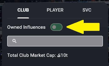 Puedes encontrar los mercados de influencia de clubes yendo a la pestaña INFLUENCIA en la barra del menú superior. Hay una barra de búsqueda que facilita encontrar el club en el que quieres comprar influencia. También hay un control deslizante en la parte superior que, cuando está activado, solo mostrará los clubes en los que ya tienes influencia.