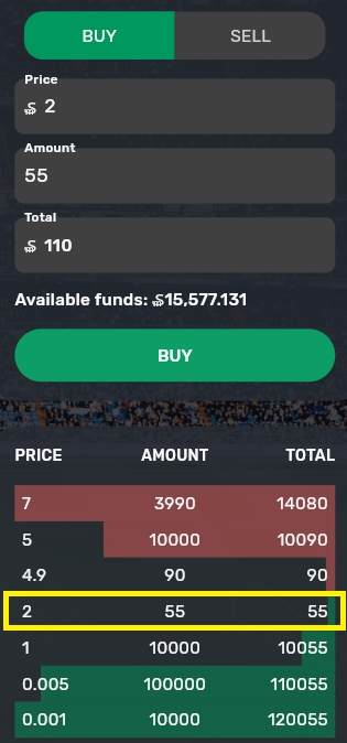 Todo lo que está resaltado en rojo son órdenes abiertas de usuarios que quieren VENDER influencia en este club. En este caso, hay un usuario que busca vender 90 de influencia por un precio de 4.9 SVC por influencia cada una. Otro usuario quiere vender 10,000 por un precio de 5 SVC por influencia cada una. La orden de venta más alta es de un usuario que quiere vender 3,990 de influencia por un precio de 7 SVC por influencia cada una. Todo lo que está resaltado en verde son órdenes abiertas de usuarios que quieren COMPRAR influencia en este club. En este caso, hay un usuario que busca comprar 10,000 de influencia por un precio de 1 SVC por influencia cada una. Otro usuario quiere comprar 100,000 de influencia por un precio de 0.005 SVC por influencia cada una. Y así sucesivamente.
