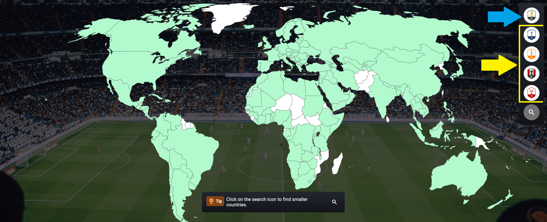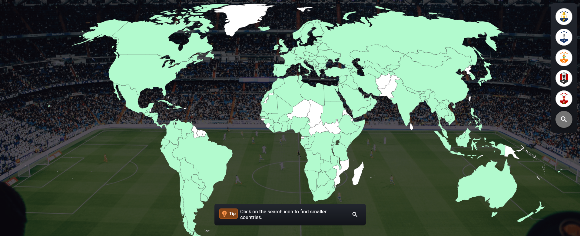 Bu harita ile Soccerverse'de hangi ülkelerin yer aldığını görebilirsiniz. Daha küçük ülkeleri bulmak için yakınlaştırabilirsiniz, ancak bazı ülkeler düzgün görüntülenemeyecek kadar küçüktür. Bu ülkeler: Singapur, Hong Kong, Mauritius, Andorra, San Marino ve Cebelitarık'tır. Bu ülkeleri bulmak için arama simgesini kullanın.