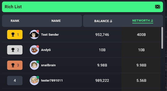 Zenginler Listesi "Bakiye" ve "Net Değer" olarak ayrılmıştır.