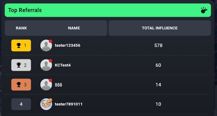 En iyi referanslar lider tablosu, yönlendirdikleri ve daha sonra mağazadan paket satın alan kullanıcılar için en çok bonus etki elde eden kullanıcıları gösterir.