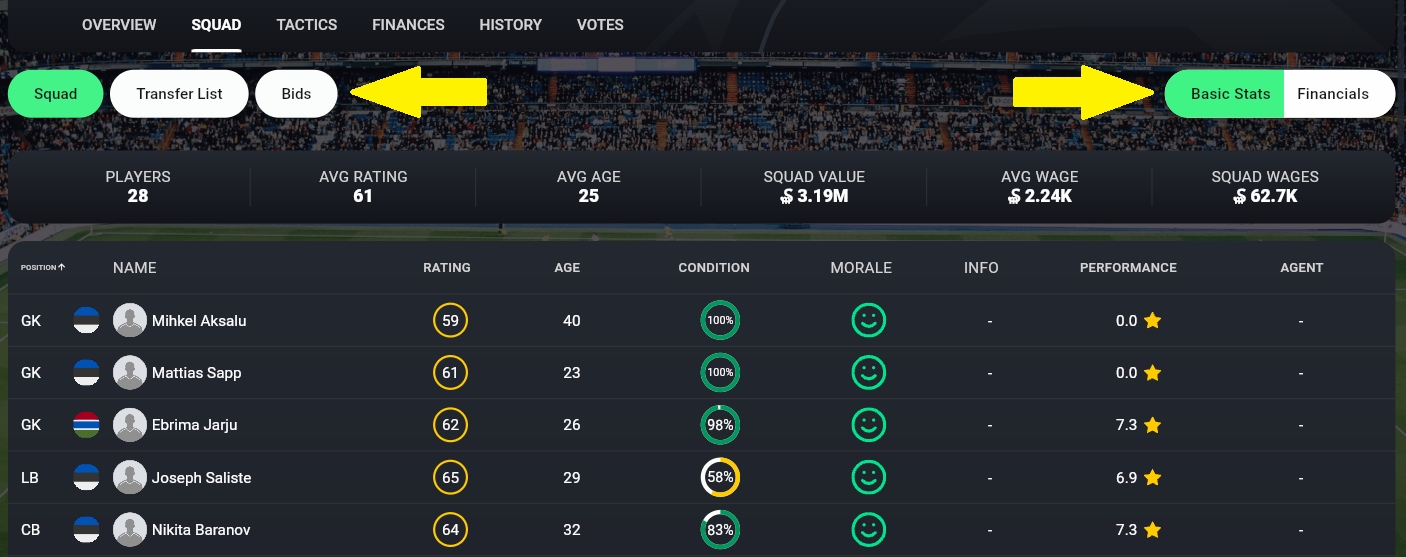TEMEL İSTATİSTİKLER'den FİNANS'a geçerek, oyuncularınızın değerlerini, ücretlerini ve bireysel sözleşme sürelerini görebilirsiniz. Sütun başlıklarına tıklayarak her şey sıralanabilir.\